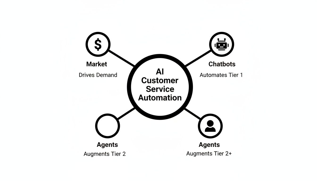 This concept map shows how market signals, chatbots, and live agents all branch from a central automation hub to deliver smooth, cohesive support.