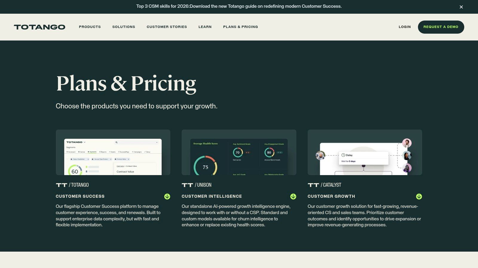 - Composable Packaging: Offers distinct packages (Unison, Catalyst, CS) designed for different maturity levels, from foundational customer success to advanced enterprise operations.