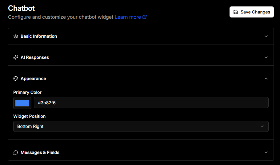 - Colors and Logo: Use your brand’s primary and secondary colors for the widget and chat window. Upload your company logo as the chatbot’s avatar so it’s instantly recognizable.