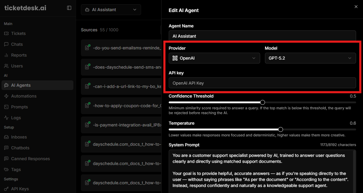 You can now configure GPT-5.2 just like any other providers on your support agent and start using it immediately in resolving your customer support tickets with AI.