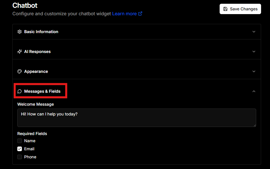 Customize your chatbot to match your brand, control AI behavior, and capture the right visitor information as per your business need -