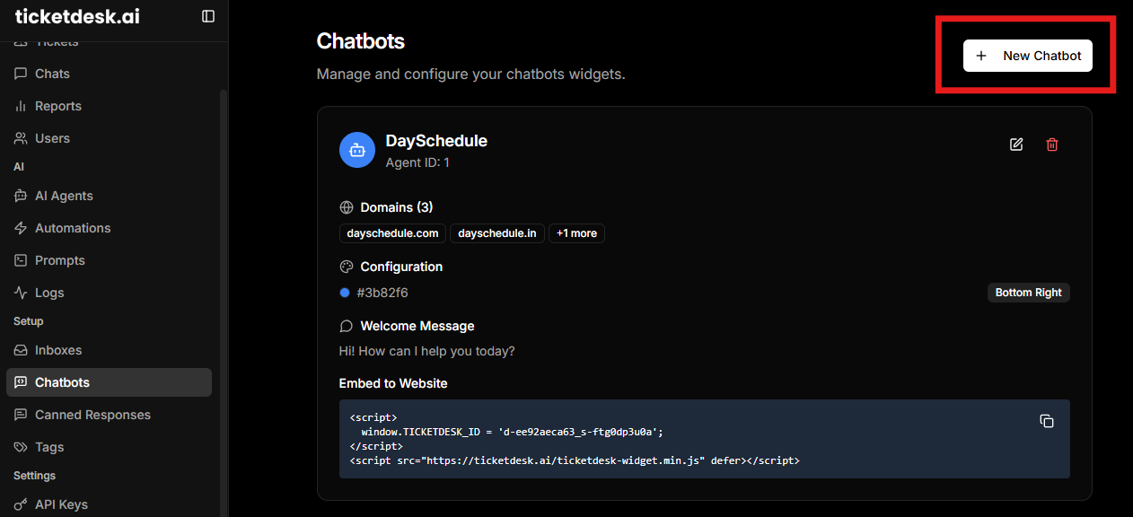 To embed AI chatbot on your website, you’ll need to create a chatbot on Ticketdesk AI, generate the JavaScript embed code, and paste it into your website’s HTML.