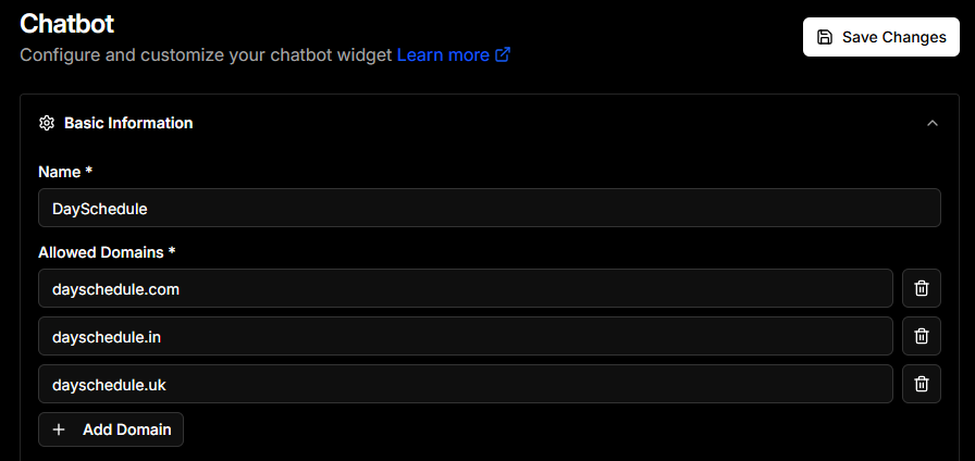 - Allowed Domains: Add the websites where the chatbot is permitted to run