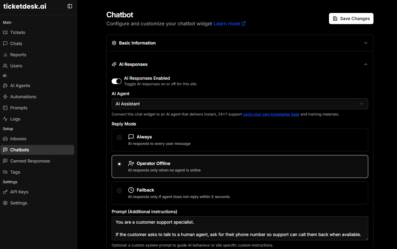 - Operator Offline - AI responds only when human agents are unavailable