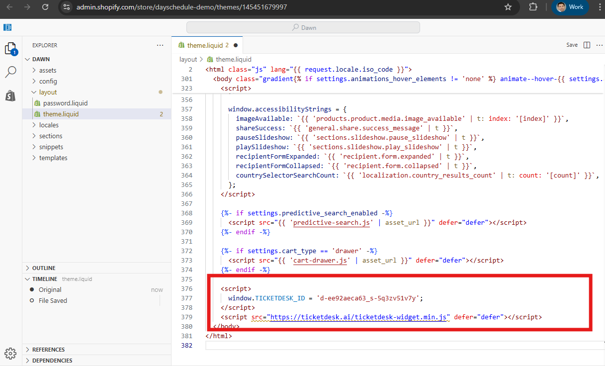 </body>tag. - Paste the following Ticketdesk AI embed code snippet, making sure to replace