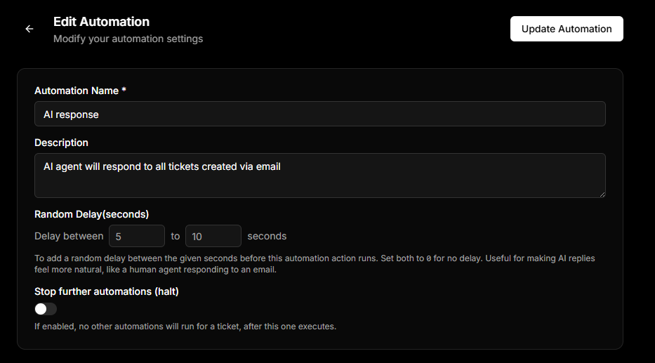 - Add an AI response action that analyzes ticket details and generates a reply automatically with delay if enabled.