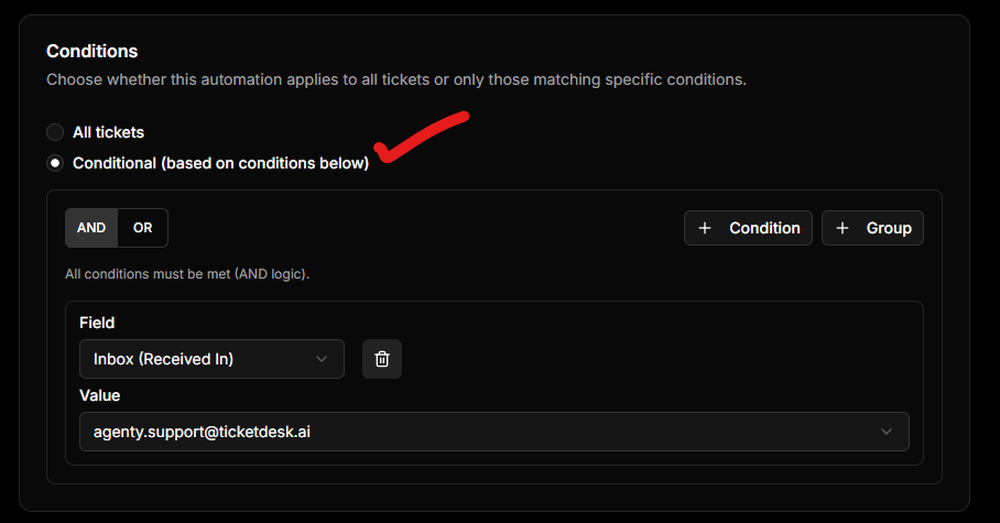 - Define the conditions to configure if the automation should run on all tickets, any particular keyword match, or when a ticket is received on particular inbox only.