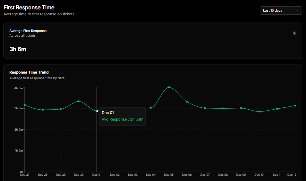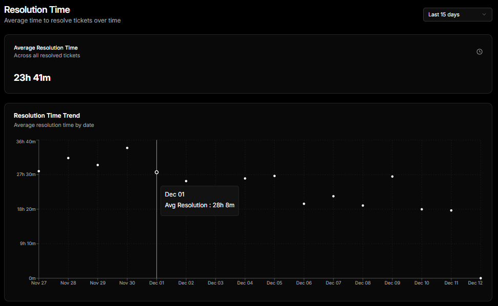 Resolution Time measures the total time it takes to fully resolve a ticket. Monitoring this helps you maintain healthy SLAs and uncover delays in your support workflow.