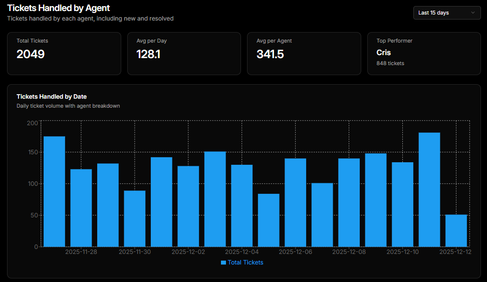 This is one of the most important reports for operational management. It shows how many tickets each agent handled per day, top performer, and % of ticket handled by each agent.