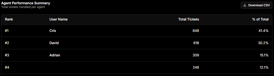 And a table with agent performance summary to find each agent, their rank and total ticket resolved by them.