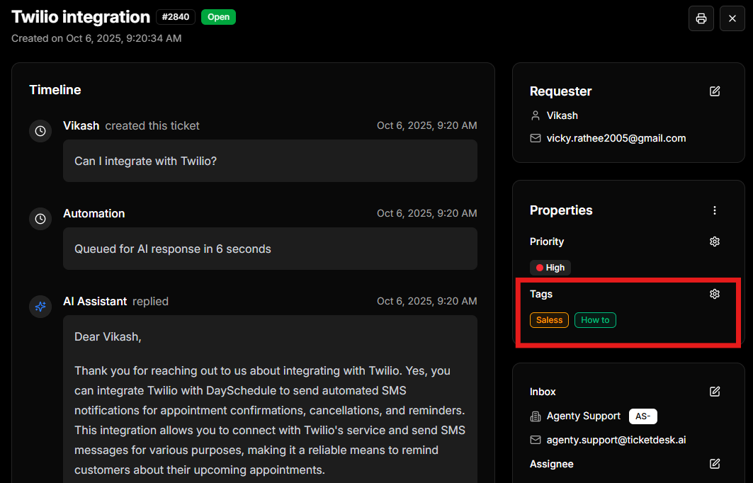 Adding tags to a ticket helps your support team instantly understand the type, category, or status of a customer support request.