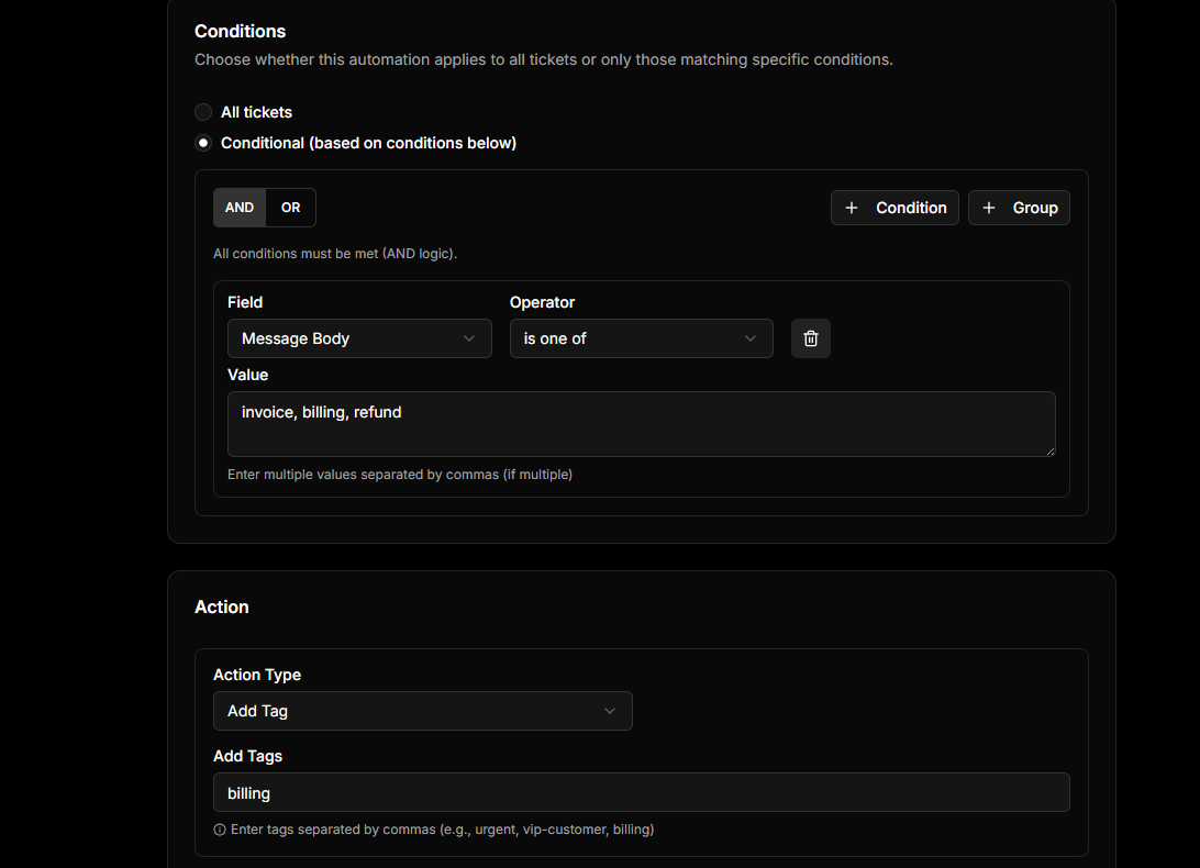 - Example: Apply the billing tag when a ticket mentions refund, payment, or invoice